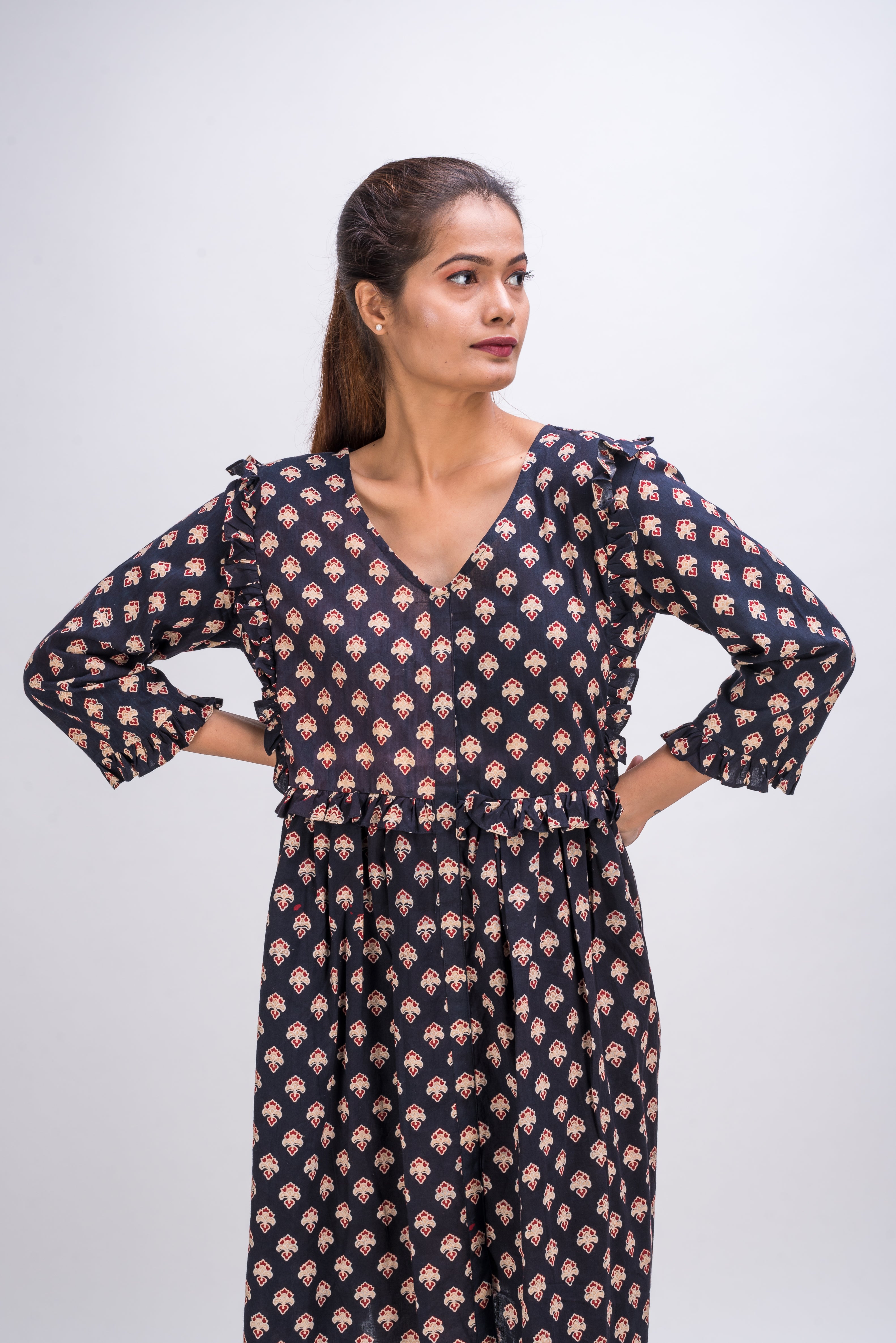 Awaken your senses in this fashionable yet a simple knee length dress. Small pleats at the end three fourth sleeve and around the chest add to the charm of this elegant dress. Wear it in between seasons or on crazy whether days, you are sure to catch few glances. Charming and comfortable dress is perfect for a warm summer days or for an evening cocktail parties!!