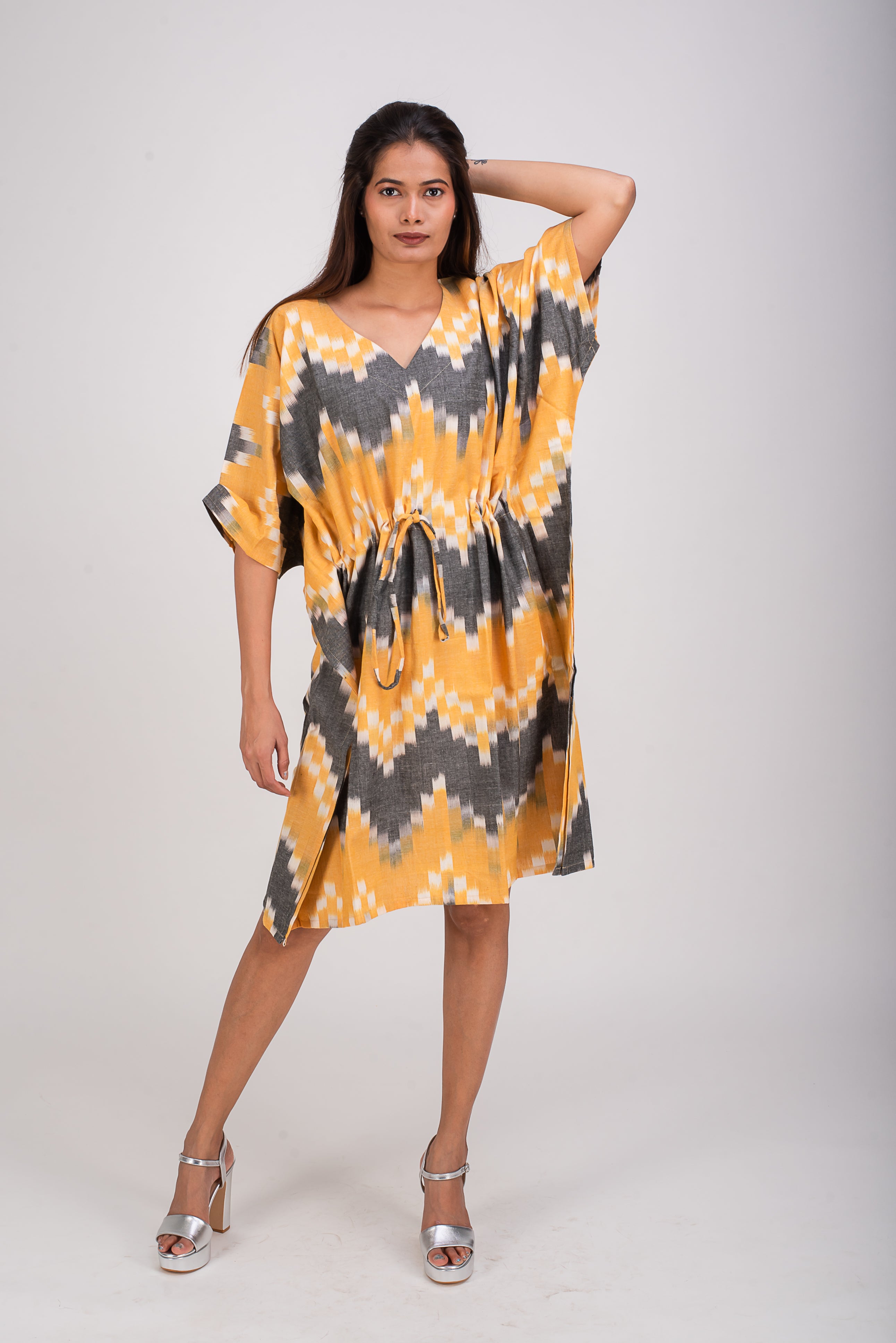 Chill in this breezy free size kaftan for a mid summer barbeque or stroll at the beach. A soft cotton knee length kaftan is practical and comfortable that is sure to remind you to take a break!