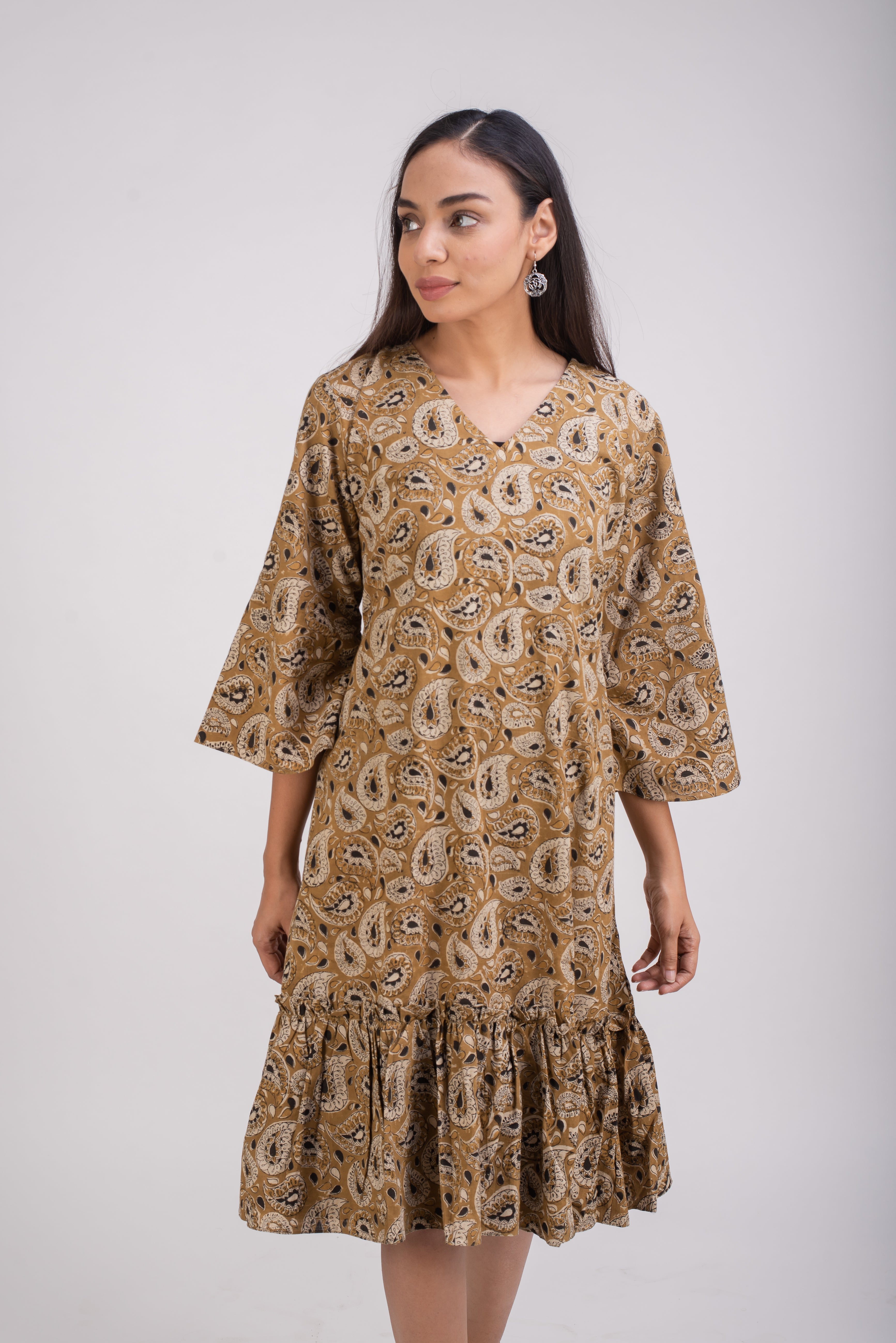 Mustard color floral block printed in vegetable dye is a tribute to kalamkari art of fabric printing. Kalmakari is a traditional art of fabric printing using vegetable dyes. The printing is done using wooden blocks chiseled from teak wood by master craftsmen. This complex and highly skilled art of printing fabric is practiced by certain families in India. Pomegranate peel, iron scrap, turmeric, Jaggrey, salt etc are used to make the vegetable dyes.