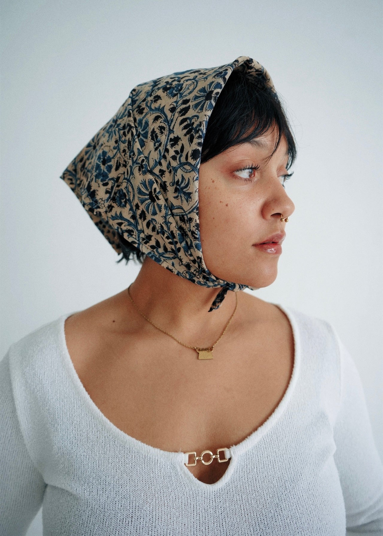 The Hazel Blooms bandana captures the delicate beauty of nature with its intricate floral design. Set against a soft ivory backdrop, the hand block-printed blooms in shades of hazel brown and muted blue intertwine with graceful vines, creating a design reminiscent of a serene garden in full bloom. The fine detailing of the flowers and leaves adds depth and texture, while the subtle, earthy tones evoke a sense of calm and timeless elegance. Crafted from lightweight and breathable voile cotton, this bandana offers exceptional comfort and versatility. Its airy texture ensures it drapes effortlessly, making it perfect for styling as a neckerchief, headscarf, or an accessory to enhance any outfit. The Hazel Blooms bandana’s natural tones and floral motifs make it a versatile piece for both casual and formal occasions. Handmade by artisans using traditional block-printing techniques and natural, eco-friendly plant-based dyes, each bandana is a one-of-a-kind creation. Slight variations in color and print reflect the handcrafted process, making every piece truly unique. Add a touch of nature’s beauty to your wardrobe with the Hazel Blooms bandana—a timeless accessory that celebrates the art of handcrafting and the elegance of floral design.