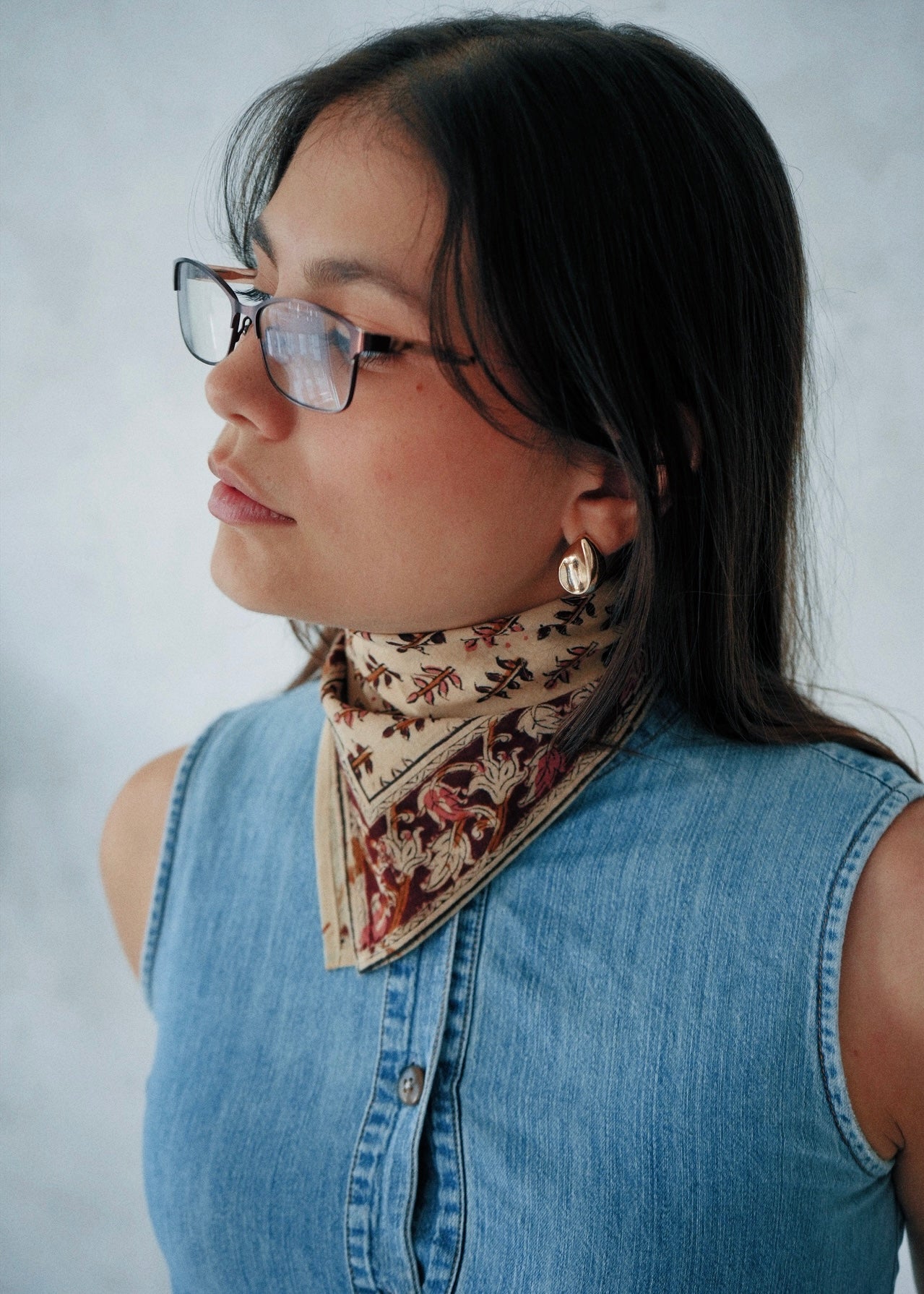 The Pine Grove Tapestry bandana features a refined and intricate pattern that draws inspiration from the beauty of nature. Delicate pine-like motifs are hand block-printed in rich earthy tones of deep brown, muted orange, and warm reds across a soft ivory background. The design brings to mind the serene charm of a quiet grove, while the intricately detailed border in deep maroon and cream floral motifs completes the look with a sophisticated flair. Crafted from lightweight voile cotton, this bandana offers exceptional comfort and breathability, making it ideal for all-day wear. Its soft, airy texture ensures that it drapes elegantly whether worn as a scarf, headband, or stylish accessory. The Pine Grove Tapestry bandana’s natural tones and elegant pattern make it a versatile piece for both casual and formal occasions. Handcrafted using traditional techniques, this bandana is block printed with natural plant-based dyes, reflecting the artisanal craftsmanship of skilled artisans. Each piece carries slight variations in print and color, making every bandana unique and special. Enhance your wardrobe with the Pine Grove Tapestry bandana, a perfect blend of nature-inspired design and timeless artistry.