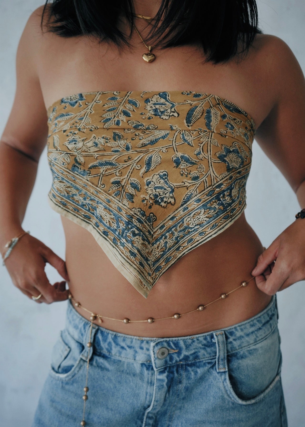 The Sapphire Bloom bandana is a captivating fusion of elegance and craftsmanship. Its vibrant floral design, in rich sapphire blue and soft ivory, spreads gracefully across a golden mustard background, evoking the charm of a blooming garden at dawn. Each hand block-printed flower is detailed with intricate leaves and vines, creating a harmonious, nature-inspired pattern. The complementary blue border, adorned with delicate floral motifs, frames the design beautifully, adding a refined touch to the piece. Made from ultra-soft voile cotton, this bandana is both lightweight and breathable, ensuring comfort throughout the day. Its airy texture allows it to drape gracefully when styled as a neckerchief, headscarf, or accessory to enhance your wardrobe. The Sapphire Bloom bandana is versatile enough for both casual and formal settings, offering a blend of sophistication and ease. Handcrafted by skilled artisans using natural, eco-friendly plant-based dyes, each bandana is a unique piece of art. The slight variations in print and color reflect the meticulous hand block-printing process, making every bandana a one-of-a-kind masterpiece. Add a touch of elegance and tradition to your style with the Sapphire Bloom bandana—a timeless accessory that embodies the beauty of nature and the skill of handcrafted artistry.