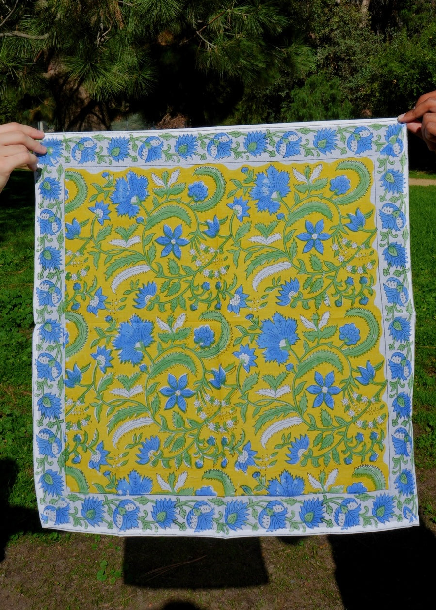 The Blue Lotus Trail bandana is a striking expression of heritage-inspired design and artisanal craftsmanship. Made from breathable cotton voile, this hand block printed piece features flowing lotus-inspired florals and graceful vine patterns in rich blue and green tones, set against a radiant mustard yellow backdrop. A finely detailed floral border frames the composition, adding balance and timeless elegance. Lightweight and versatile, this bandana is perfect for everyday accessorizing, travel styling, or as a thoughtful handcrafted gift.