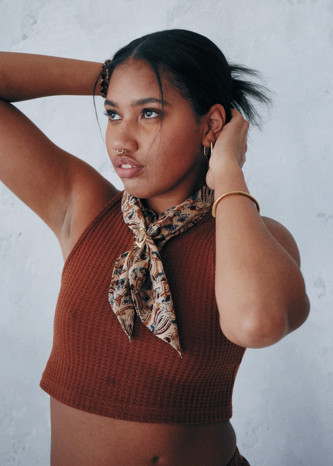 The Whispering Flora bandana captivates with its delicate floral charm. The intricate hand block-printed design features swirling floral blooms in warm hues of deep red, mustard, and soft blue, creating a mesmerizing pattern on a soft beige backdrop. The gentle rhythm of the flowers evokes the image of a quiet, blossoming garden, where each petal seems to whisper in the breeze. Made from fine voile cotton, this bandana is as comfortable as it is beautiful. The fabric’s lightweight and airy feel makes it ideal for all-day wear, offering a soft and breathable touch against the skin. Its versatile design allows you to style it in various ways, whether draped around the neck, worn as a headscarf, or tied to accessorize your favorite bag. This bandana, like all our handcrafted pieces, celebrates the beauty of traditional artistry. Each print is carefully hand-stamped by skilled artisans using natural plant-based dyes, making each piece unique. The Whispering Flora bandana is more than just an accessory; it’s a reflection of time-honored craftsmanship, with subtle variations that add to its charm and authenticity. Whether you wear it for its style or its story, the Whispering Flora bandana brings a touch of nature’s beauty to your everyday wardrobe.